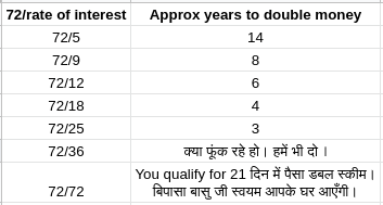 And it will also help in answering the question I asked about Veterans Rule Of 72 table. Remember they did not put number of years in the last 2 rows. Now you know why ;-).